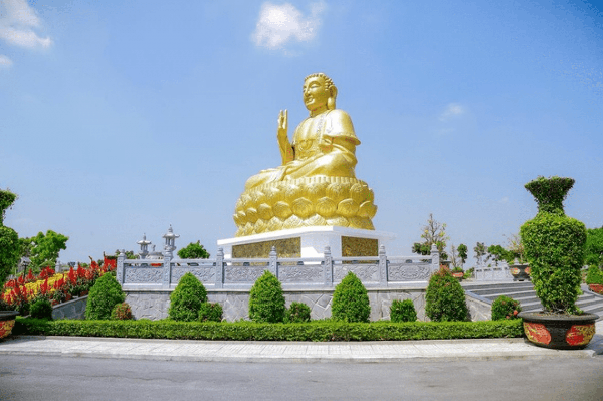 Hoa viên Bình An với các công trình danh thắng như tượng Phật Thích Ca 18 m, hồ cá Koi Vũ Môn.
