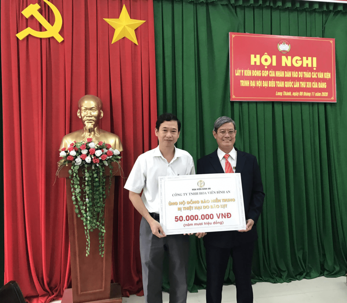 Ghi nhận tấm lòng và nghĩa cử cao đẹp của CBCNV Cty Hoa Viên Bình An, Ông Nguyễn Tấn Hưng – Chủ tịch UBMTTQ huyện Long Thành đã cảm ơn hành động thiết thực giúp đỡ người dân miền Trung lúc này, mang tới sự cổ vũ lớn lao về vật chất và tinh thần tới đồng bào.