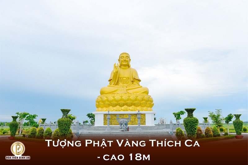 Khi đến Hoa Viên Bình An, người viếng thăm sẽ nhìn thấy cánh cổng cao hào hoa, sang trọng. Bước vào khuôn viên bạn sẽ được chiêm ngưỡng những công trình tuyệt đẹp khác như: Tượng Phật Vàng Thích Ca Mâu Ni cao nguy nga 18m, Đài Sen phun nước, Chùa Vĩnh Nghiêm, hồ nước, nhà hành chính,…