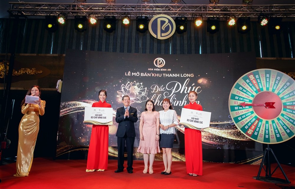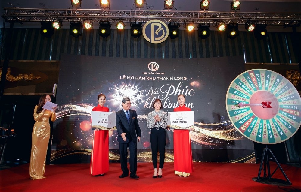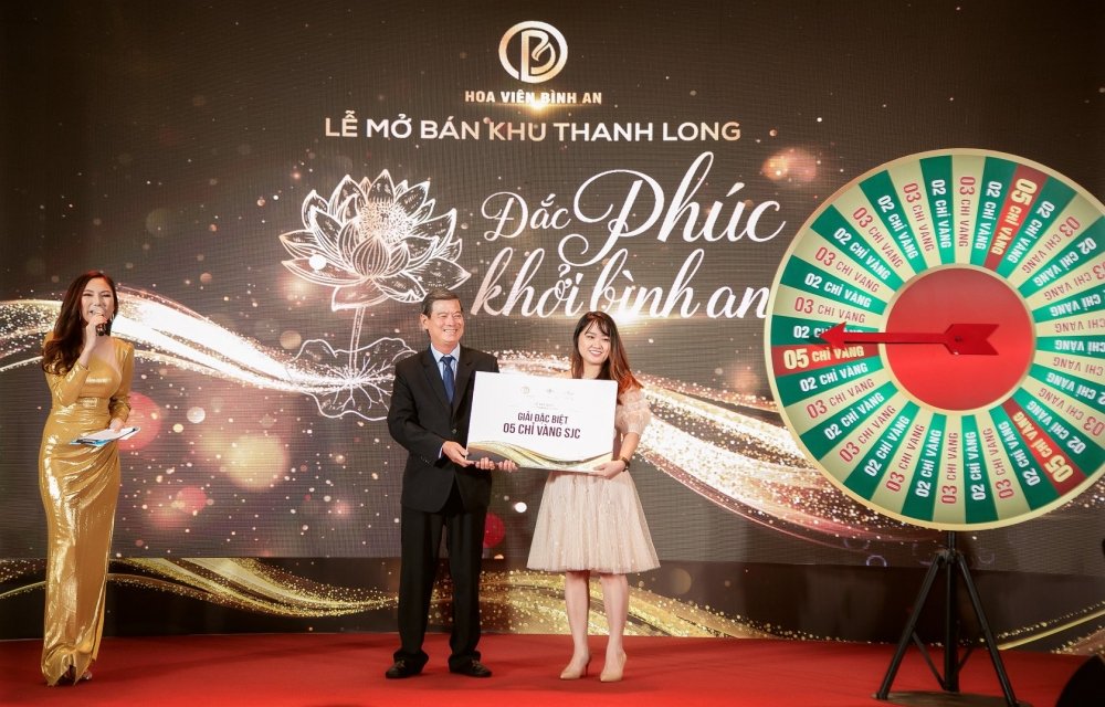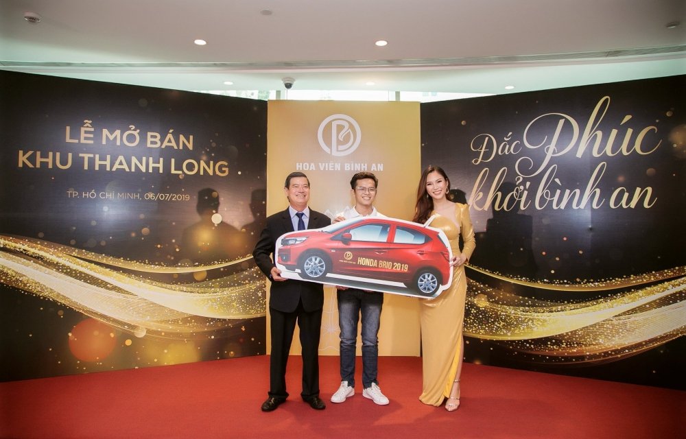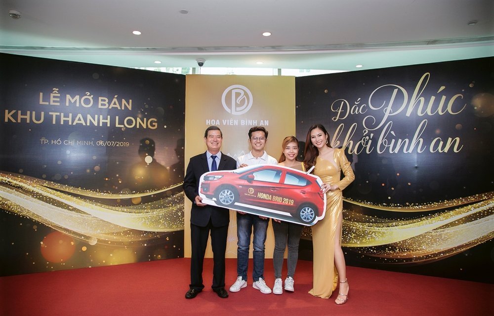 Hoa viên Bình An cũng công bố Dòng sản phẩm bất động sản độc đáo của Hoa viên Bình An là Khu nhà Từ Đường, Nhà thờ Tổ, Nhà thờ Họ và Lăng Gia Tộc đã thu hút hơn 300 khách hàng quan tâm và đặt cọc ngay tại sự kiện này. Đại diện Hoa viên Bình An chia sẻ: “Đây là dòng sản phẩm bất động sản lần đầu tiên có tại Hoa Viên Bình An. Vì giá trị văn hóa lớn lao và chương trình bán hàng đặc biệt của sản phẩm này, toàn bộ 100% sản phẩm Thanh Long Cát Tường mở bán trong đợt này đều được đặt mua hết ngay trong thời gian diễn ra sự kiện.” Trong sự kiện, Hoa viên Bình An cũng trao ngay hàng Trăm Lượng Vàng SJC 9999 và công bố giải thưởng trúng xe ô tô mới ra mắt Honda Brio cho những khách hàng may mắn. Đại diện Hoa viên Bình An chia sẻ đây là chương trình khuyến mãi lớn chưa từng có của dòng sản phẩm bất động sản độc đáo này. Nhằm đáp ứng nhu cầu tăng cao đột biến của khách hàng, Hoa Viên Bình An chính thức công bố mở thêm siêu phẩm Thanh Long Vượng Tộc – Vị trí đắc địa nhất với hàng loạt ưu đãi “khủng”.