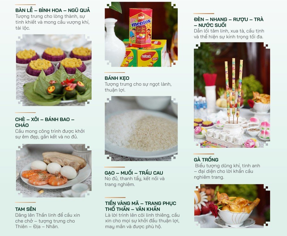 • Hoa – trái cây – xôi – chè – bánh kẹo: Thể hiện sự đủ đầy, tinh khiết và lòng thành.