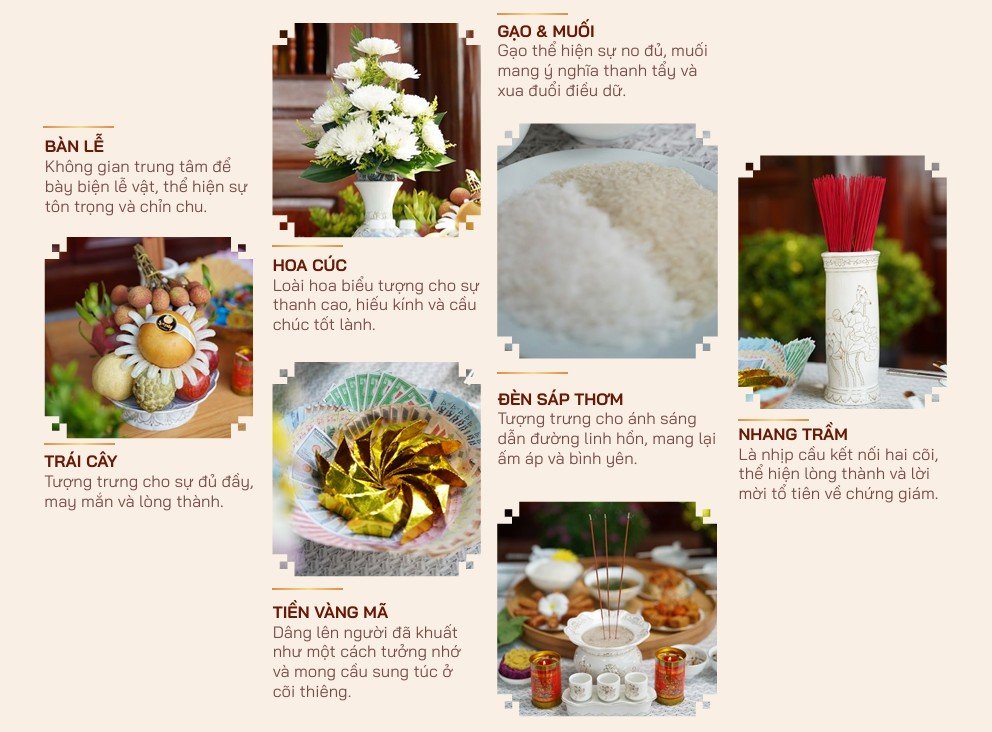 Mỗi vật phẩm trong mâm cúng đều mang một thông điệp, một giá trị tâm linh riêng biệt: